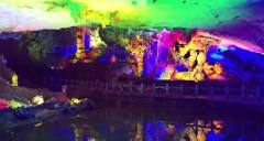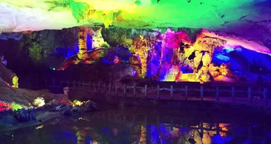 冠岩一共分为3层,上面两层为旱洞,洞内悬挂着各形各态的石钟乳,气势恢弘。和大部分的溶洞一样,它也有声光系统,洞中林立的石笋,在彩灯的照耀下,显得色彩斑斓,宛若仙境。上层到中层的电梯叫青云梯,高36米,是个观光电梯。下一层是地下暗河,长约700余米,河水清冽,哗然有声。