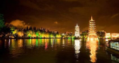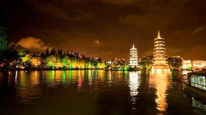 日月双塔是坐落于桂林市中心杉湖中的两座宝塔,日塔为铜塔,月塔为琉璃塔,两塔之间以湖底一条10多米长的湖底隧道相连。每到夜晚,两座塔在灯光映衬下分别散发着金银两色光芒,倒影在湖中的景象格外漂亮。日塔高41米共九层,它的通体均为纯铜装饰,金碧辉煌,铜塔所有构件如塔身、瓦面、翘角、柱梁、地面等完全由铜壁画装饰。塔内有电梯供游客观光乘坐,在日塔一层有祈福铜钟,可以撞钟祈福。同时,在一、二层还设有茶庄,还可以品茗赏景。月塔高35米共七层,为琉璃塔,它通过水下10多米长的湖底隧道与日塔连接。月塔每层的雕花彩绘门窗寓意不同的主题,富含中国传统韵味。其地宫之中有桂林明代青花梅瓶大型壁画,而一层面湖处有“太极鼓”,可以击鼓一展雄姿。双塔的四周、内墙、门窗等处都充满了五彩缤纷的图案,颜色主要以黄、绿、白、蓝、黑为主。这些壁画主要反映了桂北文化,图案以各种花草植物和‘瑶王印’为主,体现了少数民族追求精美生活的文化特征。如果不准备花钱登塔,只是想看下或者拍摄下这个桂林地标,可以在杉湖沿岸观看。观看的理想时间是晚上,每晚双塔的灯光会亮起,一座为金黄色灯光,另一座为银白色灯光。