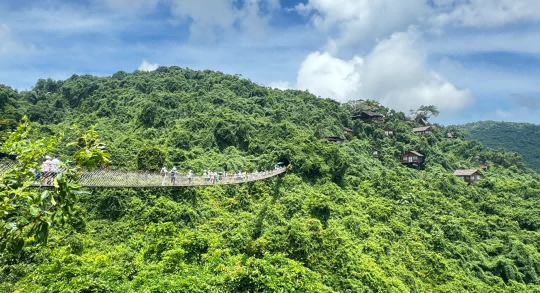 亚龙湾热带天堂森林公园景区位于亚龙湾国家旅游度假区内,电影《非诚勿扰II》、电视剧《亲爱的,热爱的》在海南三亚的主要取景地。园区定位于国际滨海生态观光兼生态度假型森林公园,被专家美誉为第三代森林旅游产品的典范之作。园区内树木葱茏,能看那藤萝密布、溪水潺潺,可遇到那百年古藤、参天巨榕,能听闻虫唱鸟鸣,极尽野趣。景区内随处都可见《非诚勿扰II》、《亲爱的,热爱的》中的场景,舒淇、葛优、杨紫、李现走过素有情人桥之称的“过江龙索桥”,悬崖边的“峭壁天池”、见证浪漫爱情的《非诚勿扰II》里的试婚房、网红玻璃栈桥等,都是情侣们不可错过的打卡地。漫步天街,享受北纬18°天街慢生活,行走在全海景玻璃栈桥上将亚龙湾的美景尽收眼底,面朝大海,背靠青山,四季花开。