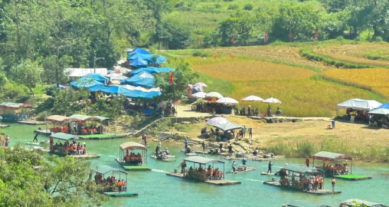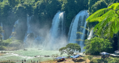 游览时,可以走到瀑布对面的山腰栈道上观看瀑布的全景,如果想要近距离地看瀑布,还可以在岸边坐竹筏在河面上看景拍照。因为是两国之间的界河,这样就相当于出了一次国,河面上,还会遇到越南人划着竹筏卖点小东西,挺有意思的。